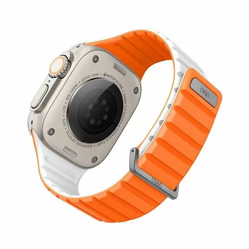 Двусторонний ремешок из мягкого силикона Uniq REVIX EVO для Apple Watch с размером корпуса 49-46-45-44. Вы можете легко поменять внешние стороны ремешка в зависимости от своего стиля и предпочтений. Фиксируется на руке с помощью удобной магнитной застежки, выдерживает нагрузку до 1.2 кг. Возможность регулировки длины за счет встроенных магнитов обеспечивает точное соответствие размерам руки. Металлическая стальная застежка дополнительно фиксирует устройство на запястье, позволяя не беспокоиться об утере даже при занятиях спортом.