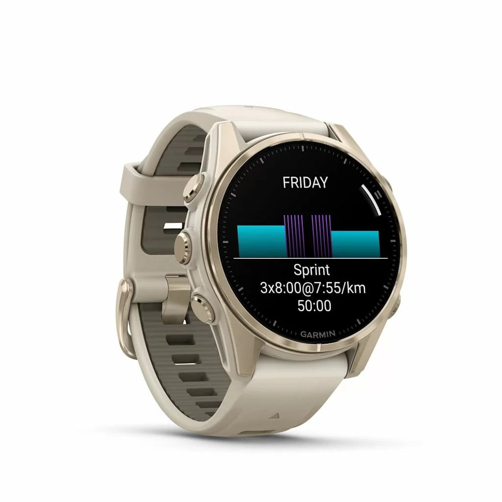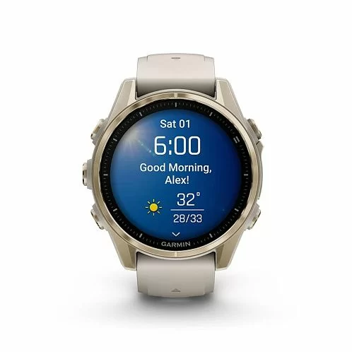 Garmin Fenix 8 получили сенсорный экран и диагональю 1,3 дюйма с разрешением 416х416 точек. AMOLED матрица передает картинку в высокой яркости и контрастности, изображение хорошо видно даже под углом. Экран защищен стеклом Power Sapphire, устойчивым к царапинам. Дисплей может отображать время в аналоговом и цифровом формате.